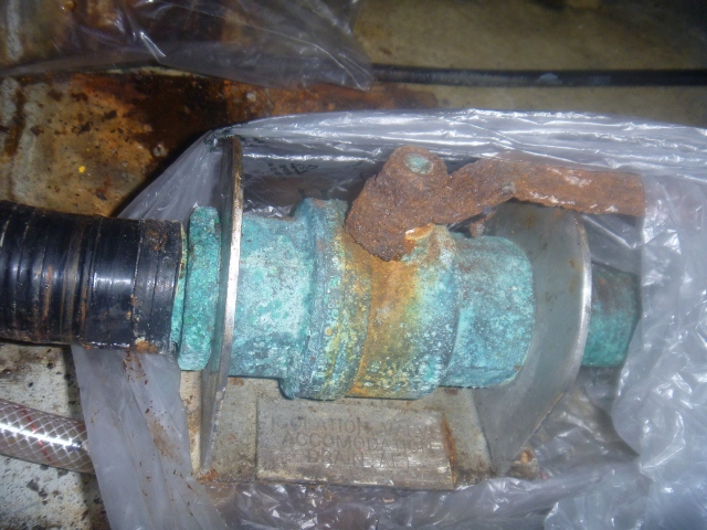 I have been tackling some of Darling’s not so sparkling aspects this week. There are a few watertight bulkhead valves which would not close even with a sledgehammer. So all three are removed and the bilge paint had come off so the whole section of the bilge between the guest cabins and engine room is now painted with white primer. The valves had to be completely changed out and were reinstalled with corrosion guard sprayed on them.