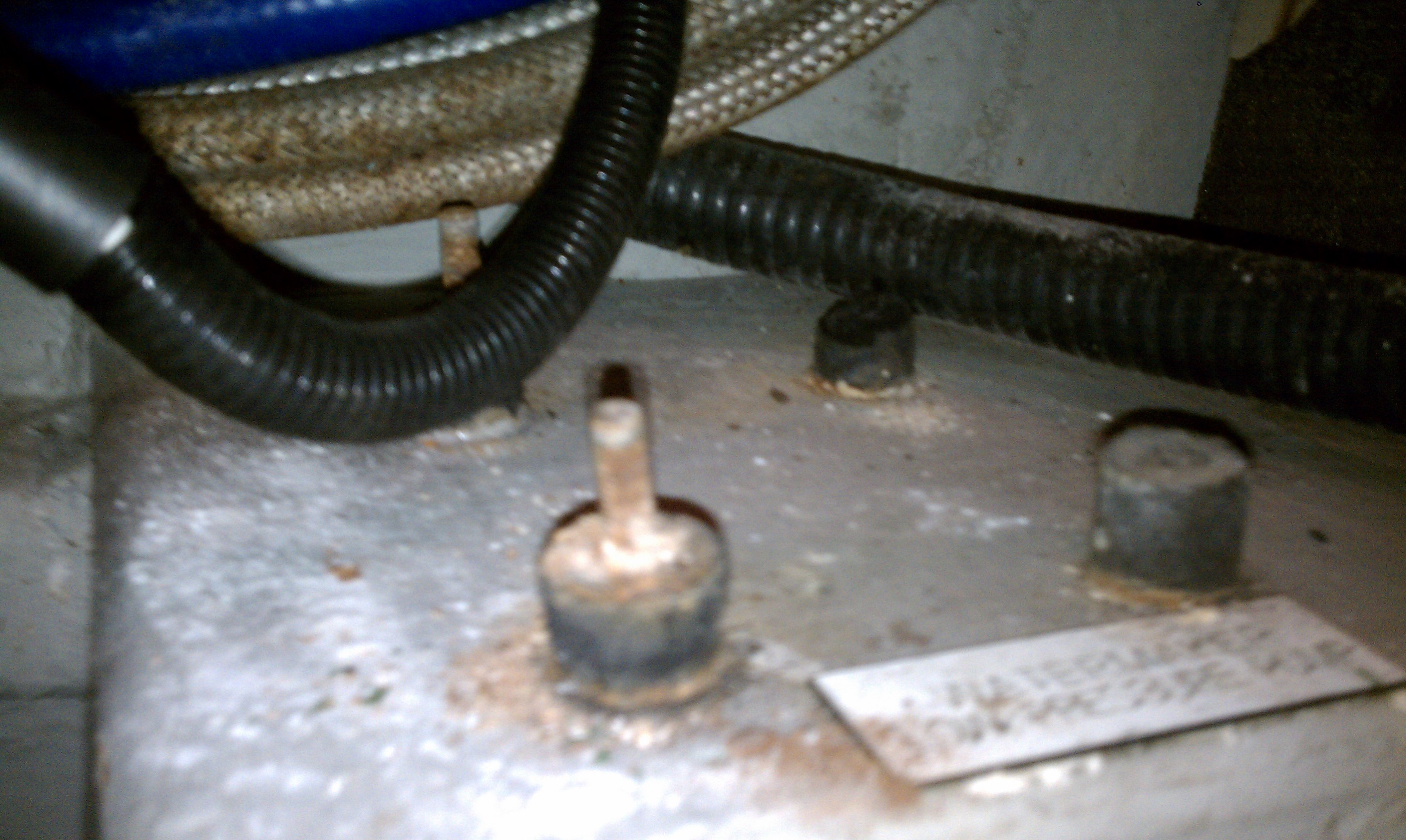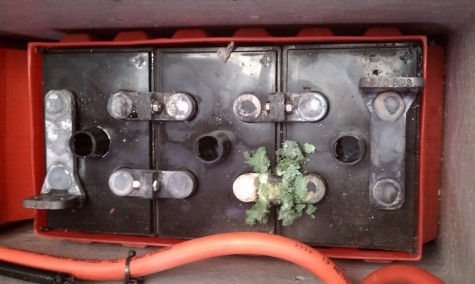 The batteries had been overheating for a while and the old captain had disconnected the ones that were in the worst shape. The electroyte had cystallised leaving a causic residue in the bilges.